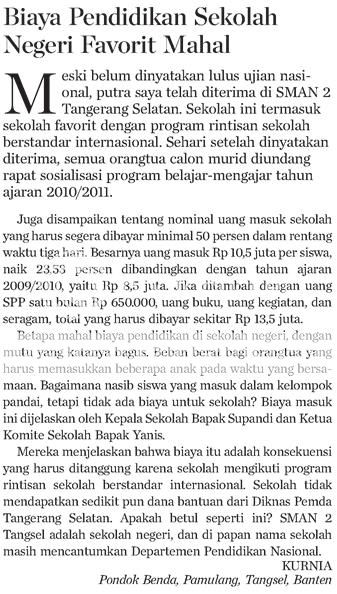 Miris banget... hatipun tersentak... dikala ngebaca kolom "redaksi yth" halaman 7 kompas terbitan 18 Mei 2010. Total biaya masuk sekolah yang beliau sampaikan ini seperti uang DP sewaktu mo beli kredit produk property dan produk otomotif.